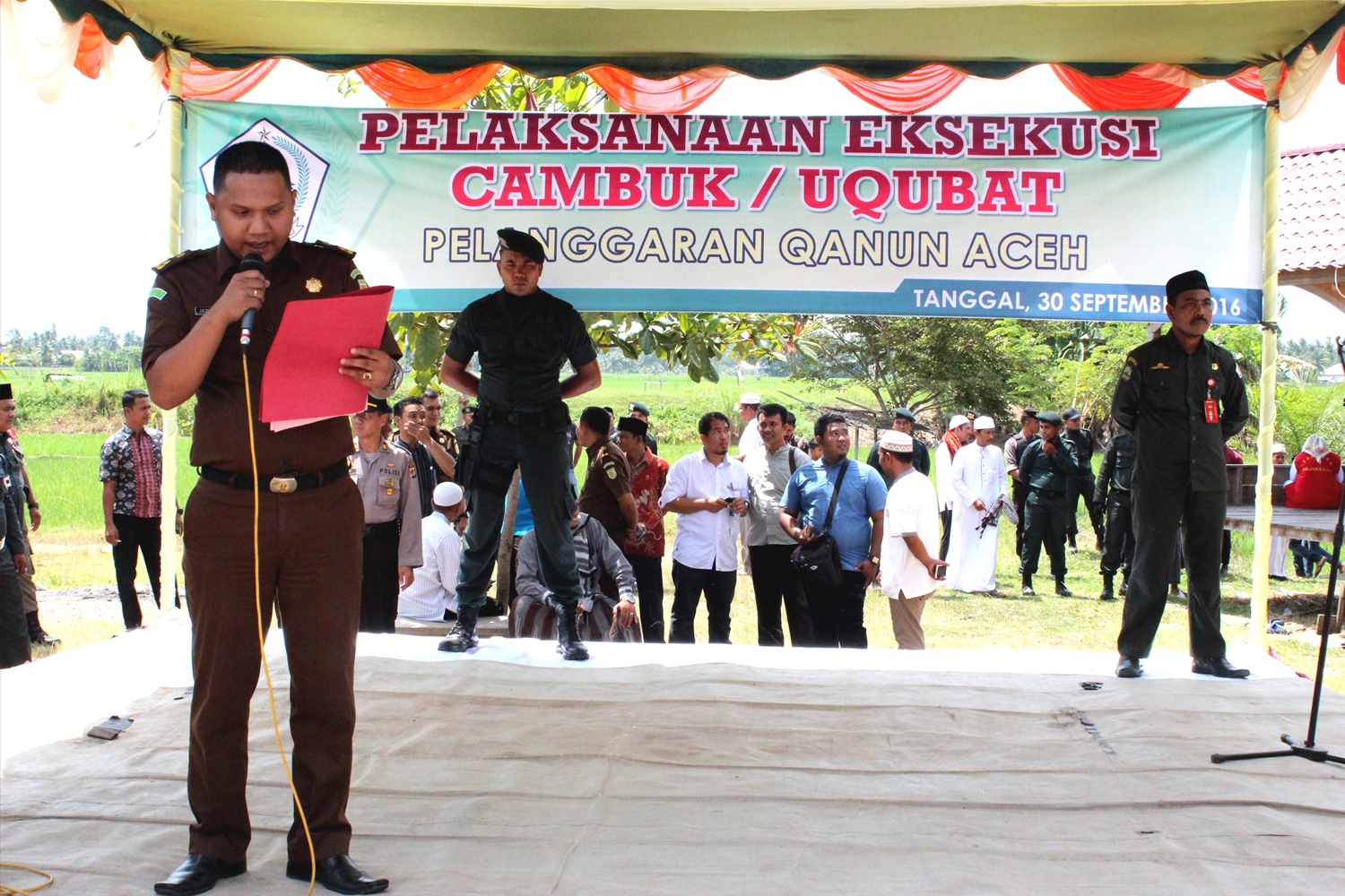 Kejaksaan Negeri Aceh Utara, Jum'at (30-09-2016) melaksanakan eksekusi hukuman cambuk/'uqubat berdasarkan putusan Mahkamah Syar'iyah Lhoksukon yang telah berkekuatan hukum tetap terhadap para terpidana atas nama Mirza Bin M. Saleh, Rosleini Binti Muhammad, Abdul Muthaleb Bin Yunus dan Muzakir Bin M. Sufi.