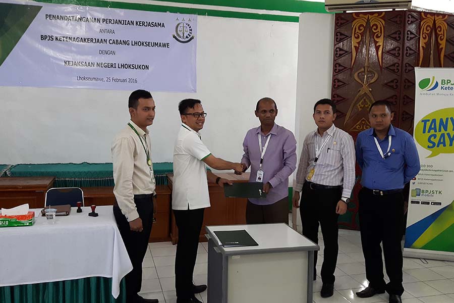 LHOKSUKON - Kejaksaan Negeri Lhoksukon, Aceh Utara menandatangani kesepakatan bersama dengan Badan Penyelenggara Jaminan Sosial (BPJS) Ketenagakerjaan Cabang Lhokseumawe, Kamis, 25 Februari 2016.