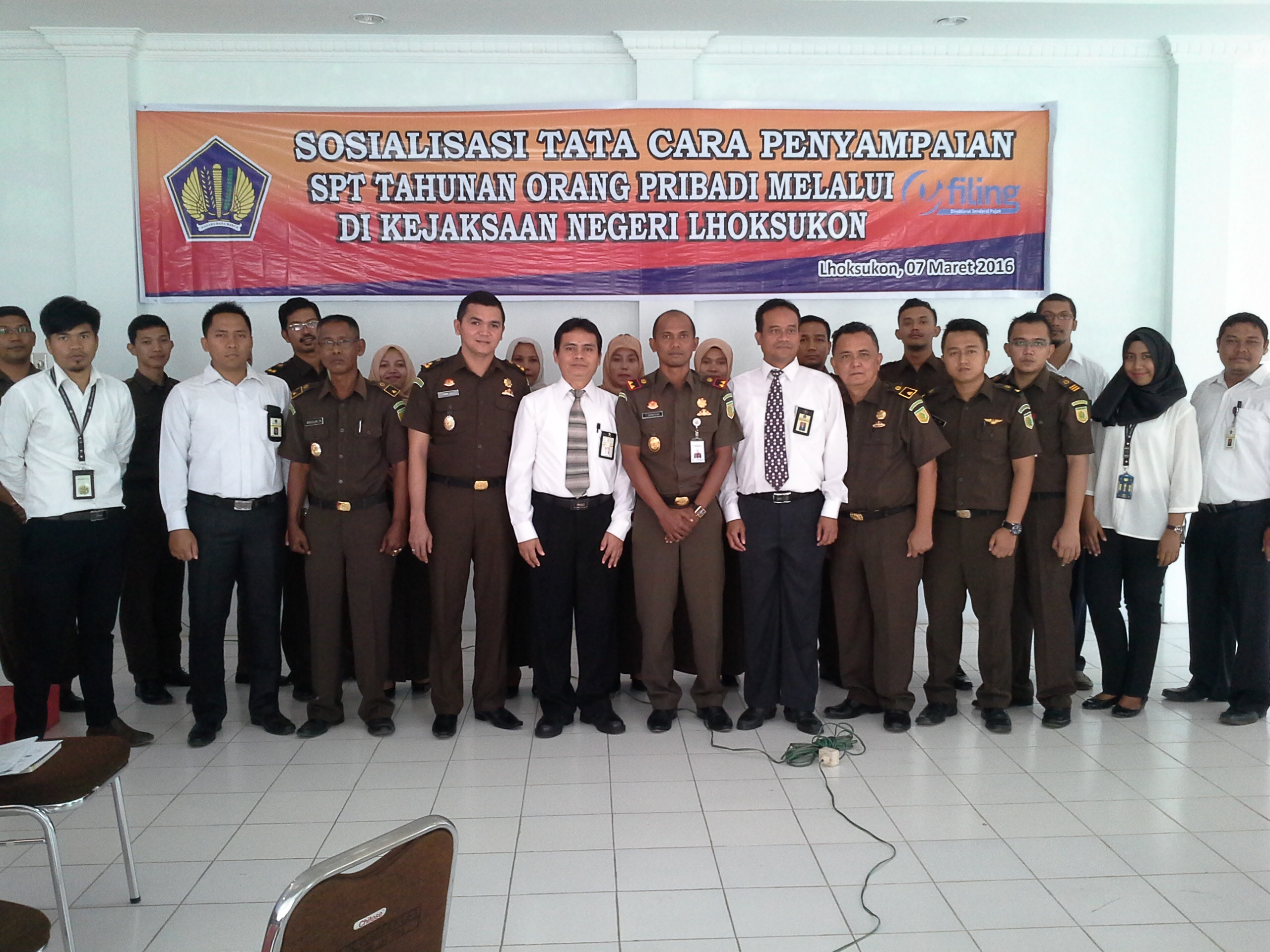 Pihak Kejaksaan Negeri Lhoksukon pada hari Senin tanggal 07 Maret 2015 sekira pukul 10.00 wib melaksanakan sosialisasi SPT Pajak Pribadi E-Filing bertempat di Aula Kantor Kejaksaan Negeri Lhoksukon. Sosialisasi tersebut disampaikan oleh Tim dari Kantor Pajak Pratama (KPP) Lhokseumawe dan tim dari Kantor Pelayanan Penyuluhan dan Konsultasi Pajak (KP2KP) Lhoksukon yang diikuti oleh seluruh pegawai Kejaksaan Negeri Lhoksukon.